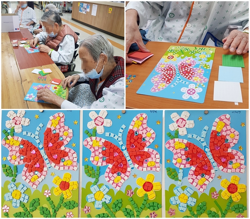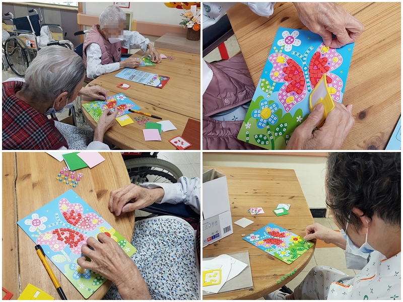 10월 11일과 12일에는 미술요법시간으로 모자이크 작품을 만들어보았습니다.