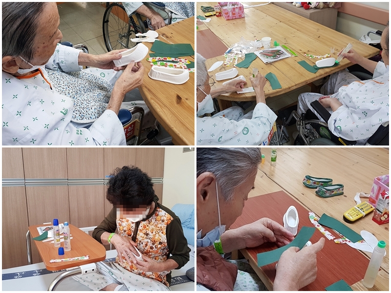 물풀을 이용하여 한지를 고무신에 붙여서 완성하는 활동이였는데요