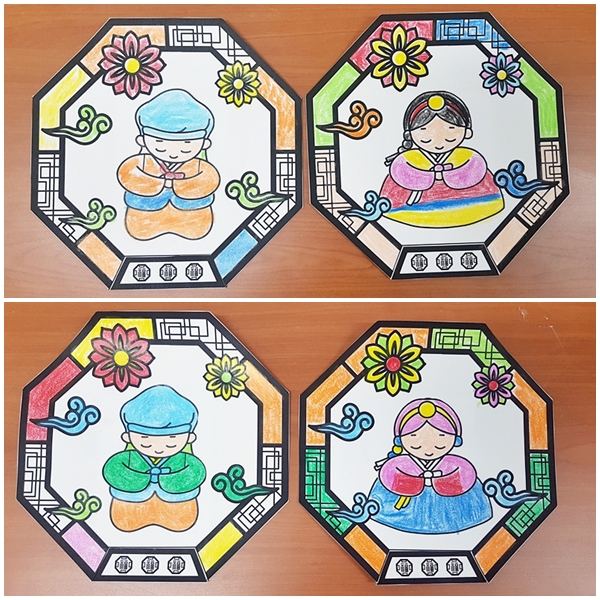 먼저 도안을 색칠한뒤 두 개의 그림을 오려서 붙였으며, 세배하는 모습을 완성하였습니다.