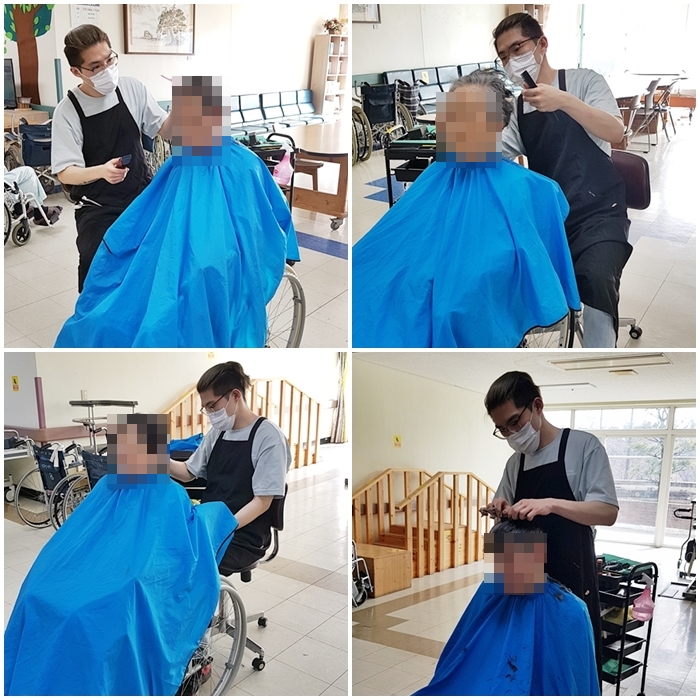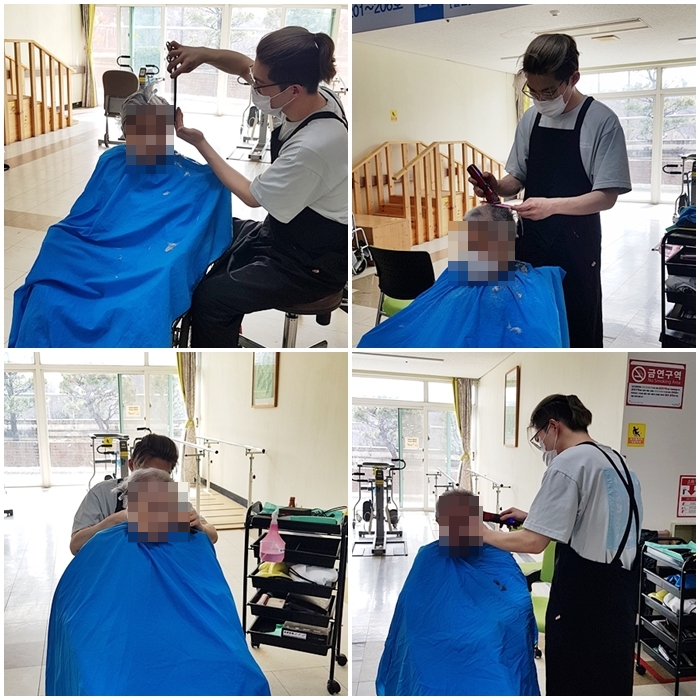 봉사자 선생님께서 웃으시면서 환자분들의 머리를 다듬어 주셨습니다.