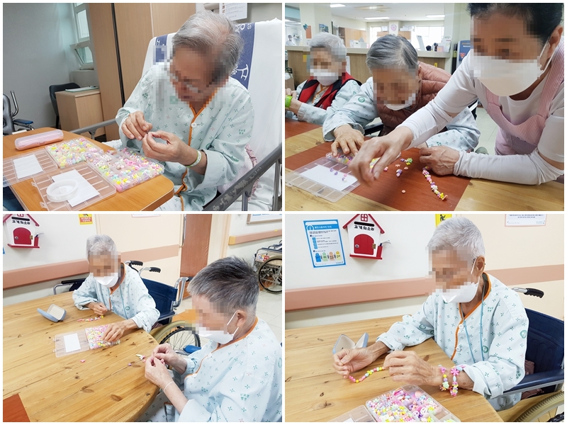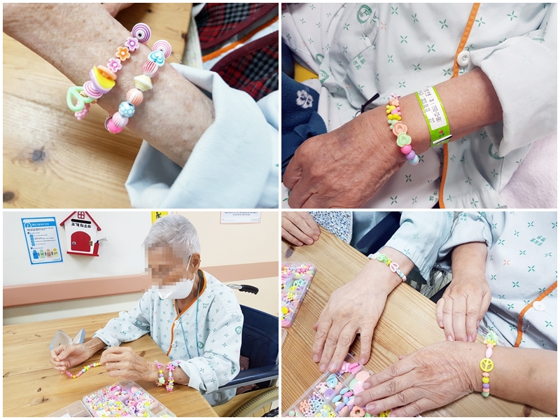 차근 차근 비즈구슬을 꿰시더니 어르신들 모두 팔찌를 완성하셨습니다.