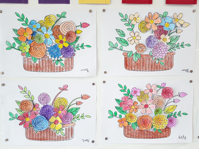 바탕이 되는 꽃 바구니에 색칠을 하고, 입체꽃은 색칠후 오리고 붙여서
