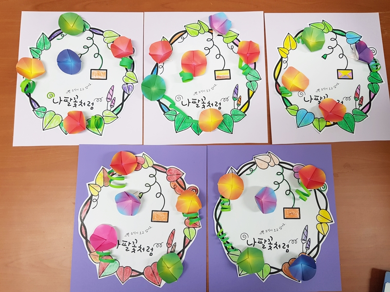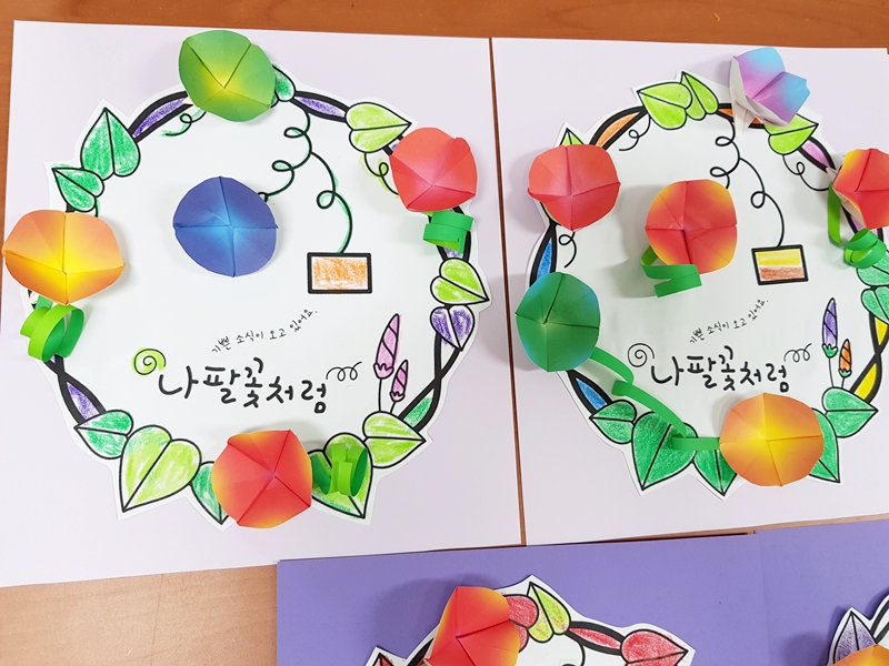 도안을 직접 색칠한 다음 나팔꽃을 색종이로 함께 접어보았는데