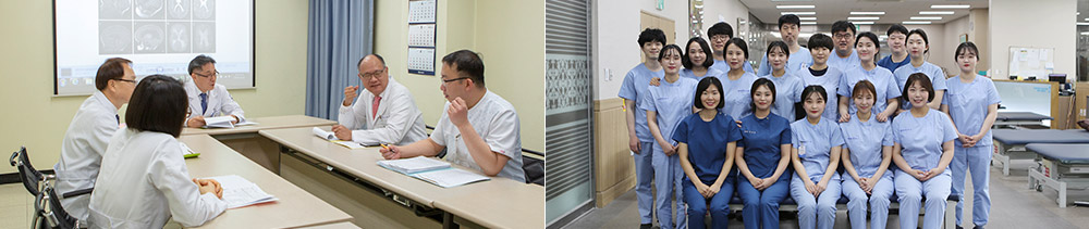 노인성 질환은 물론 특수 재활치료와 성인병에 대한 전문적인 지식을 갖춘 의료진과 간호사, 체계적인 교육과정을 마친 재활치료사와 케어복지사의 맞춤 치료 및 다양한 프로그램을 통한 감동의 의료서비스를 실천하고 있습니다.