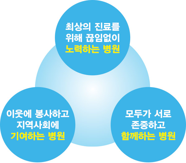 환자의 건강과 존엄성을 지켜 행복한 지역사회를 만들기 위해 봉사한다.