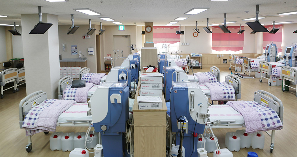 인공신장실에서는 말기 신장질환으로 신장 기능이 소실된 환자들에게 	신장을 대체하는 투석 치료를 시행하고 있습니다.